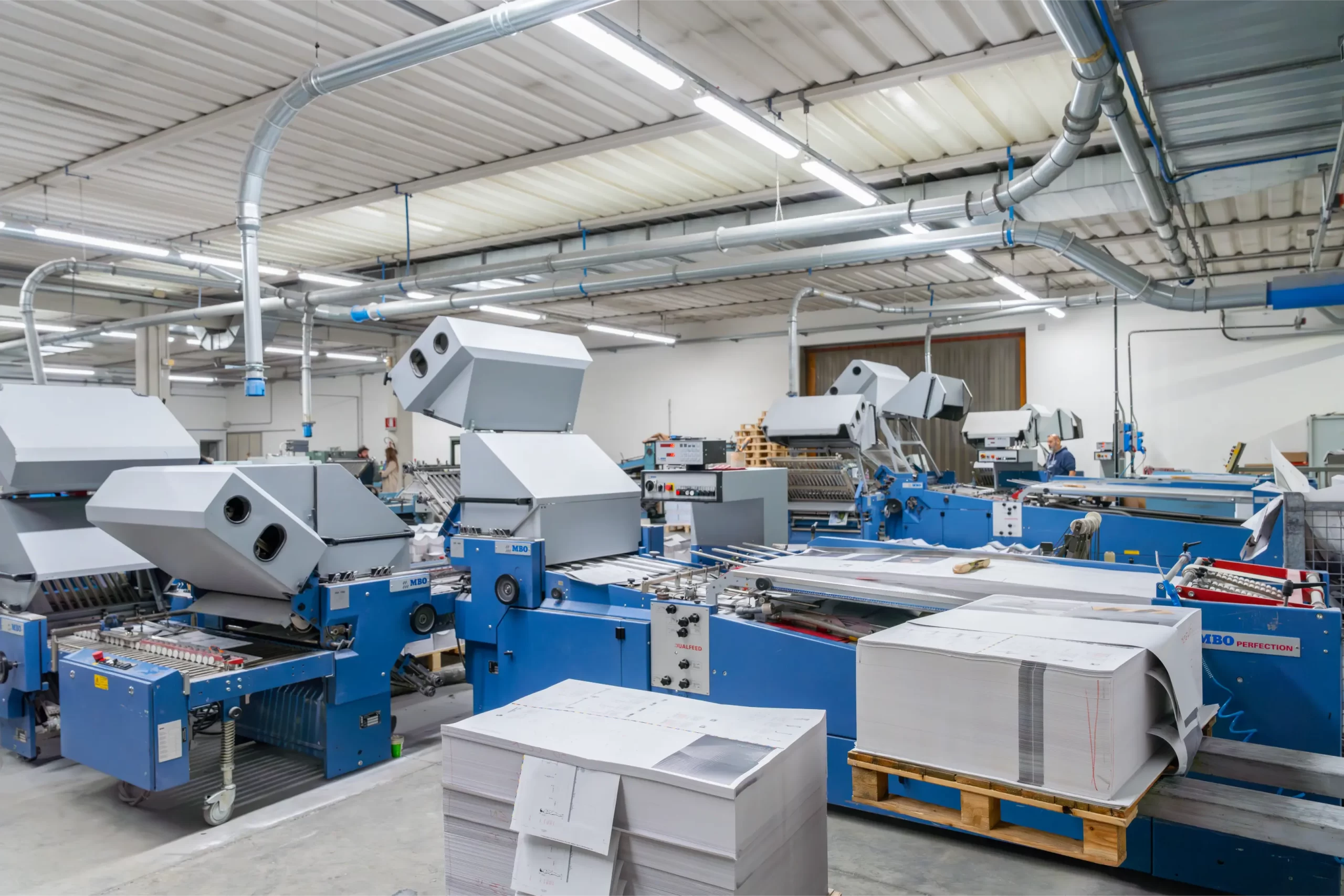 La piegatura folder è affidata a 3 macchine piegatrici automatiche MBO, progettate per gestire pieghe semplici e creative con registro stabile. Ogni macchina lavora con rulli e coltelli regolabili, mantenendo continuità e pulizia della piega anche su supporti di grammatura variabile.